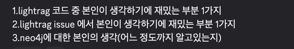 개인적인 생각으로는 활용한 샘플 데이터셋을 간단히 찾아 Light RAG 검색 결과를 본 후에 문제점을 찾아 남은 시간 동안 개선하고 통합하여 궁극적인 Ontology based RAG 한판을 만들어보아야겠습니다!