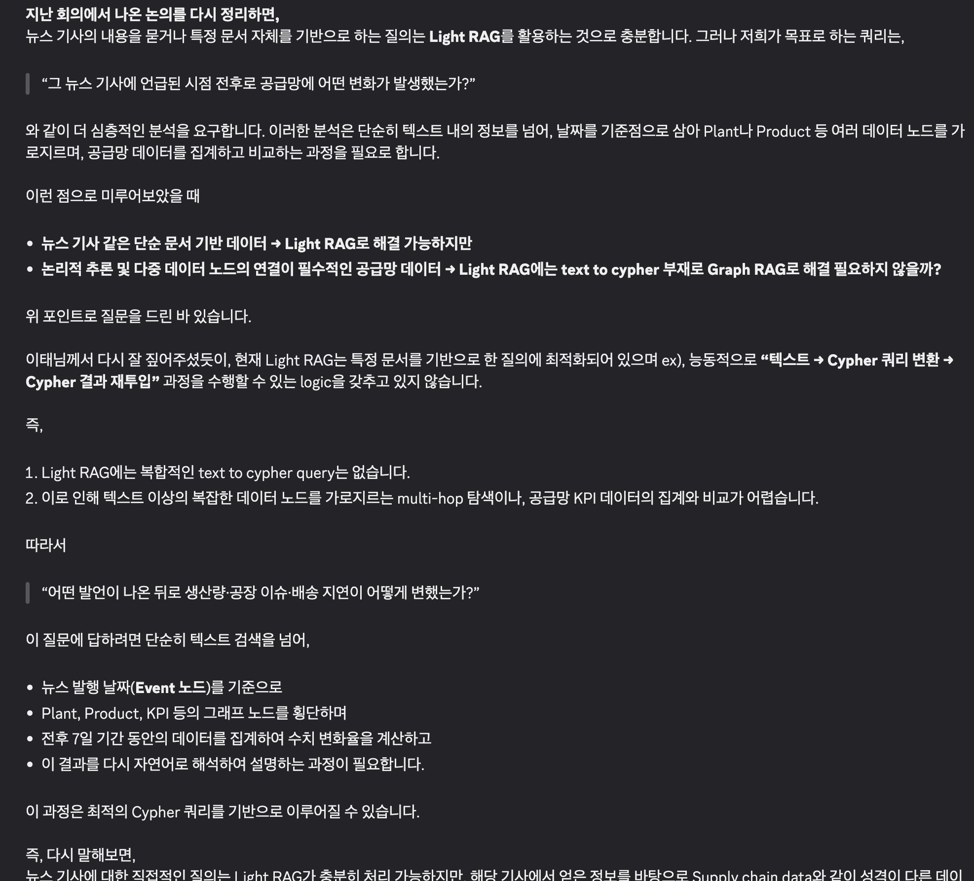 Light RAG의 적합한 Task는 무엇인지, 왜 Supply chain Ontology를 검색하기 어려운지를 말하기 위해 위 메세지를 보냈었습니다.