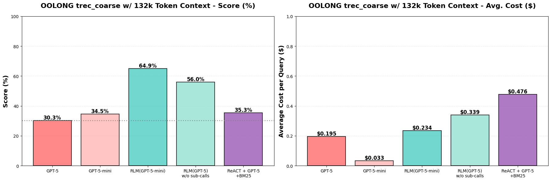 - RLM(GPT-5-mini) 가 2배 이상 성능 향상