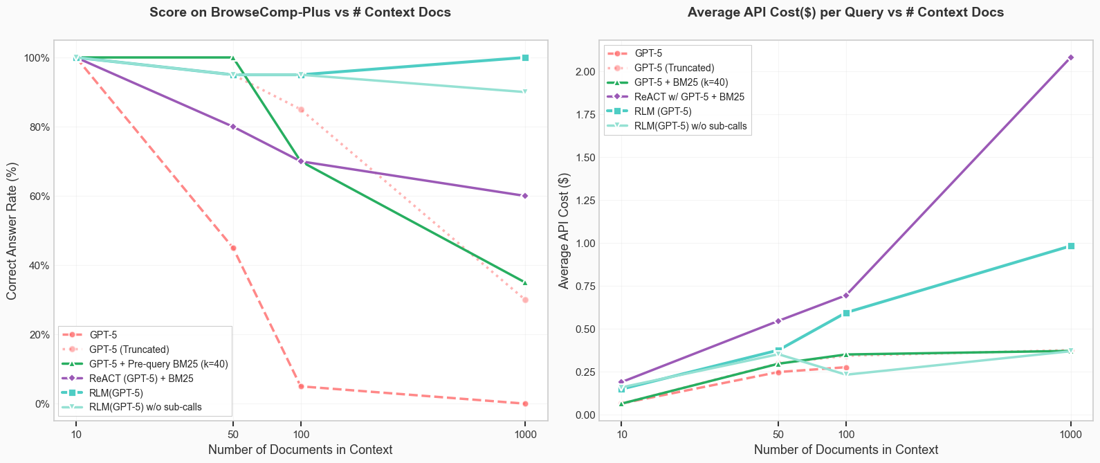 - RLM(GPT-5): 1000 문서에서도 완벽한 성능 유지