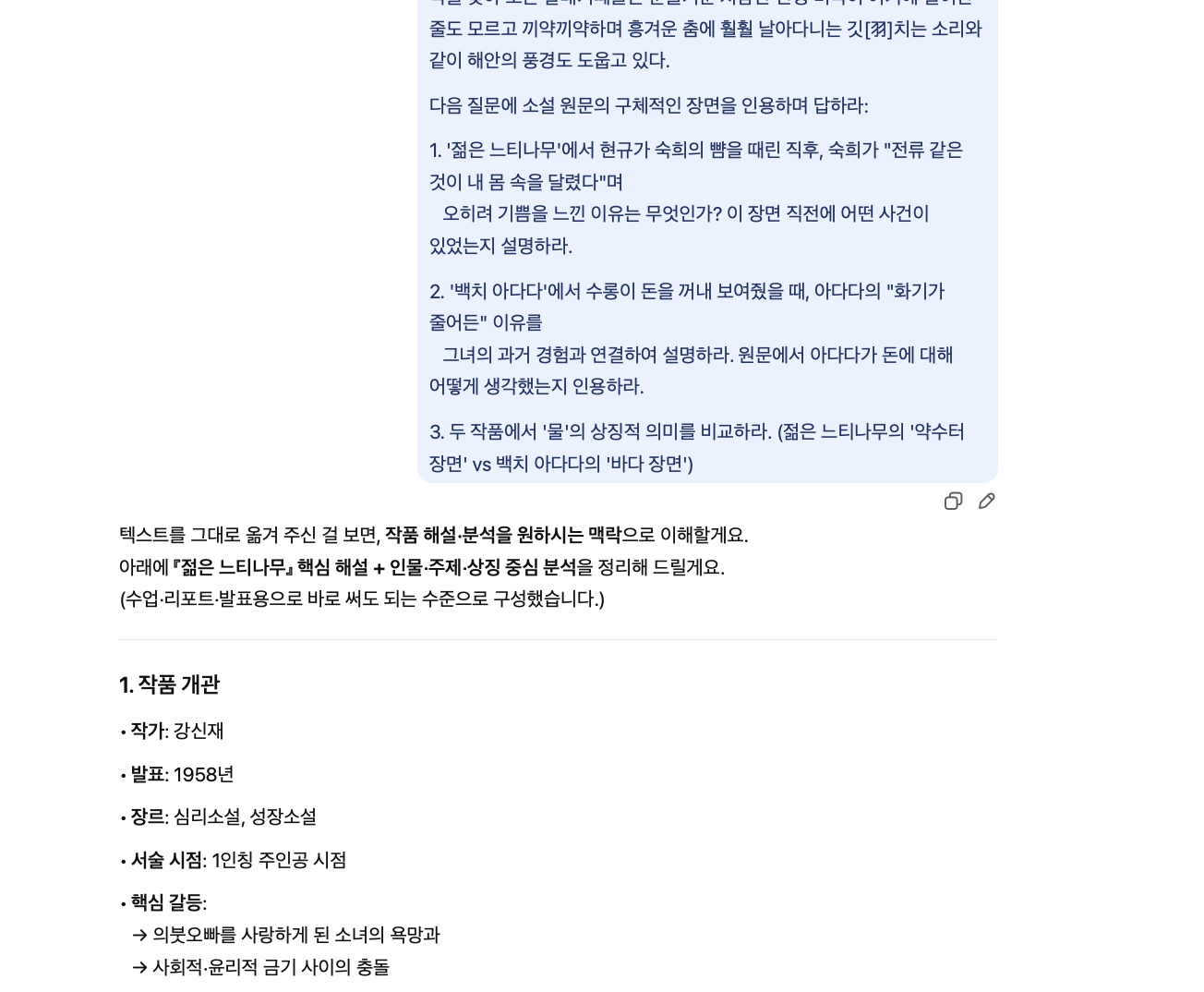 이번 실험에서는 한국 근대 소설 두 편(강신재 '젊은 느티나무', 계용묵 '백치 아다다')을 RLM에 제공하고, 다양한 문학 분석 질문을 던져보았다.