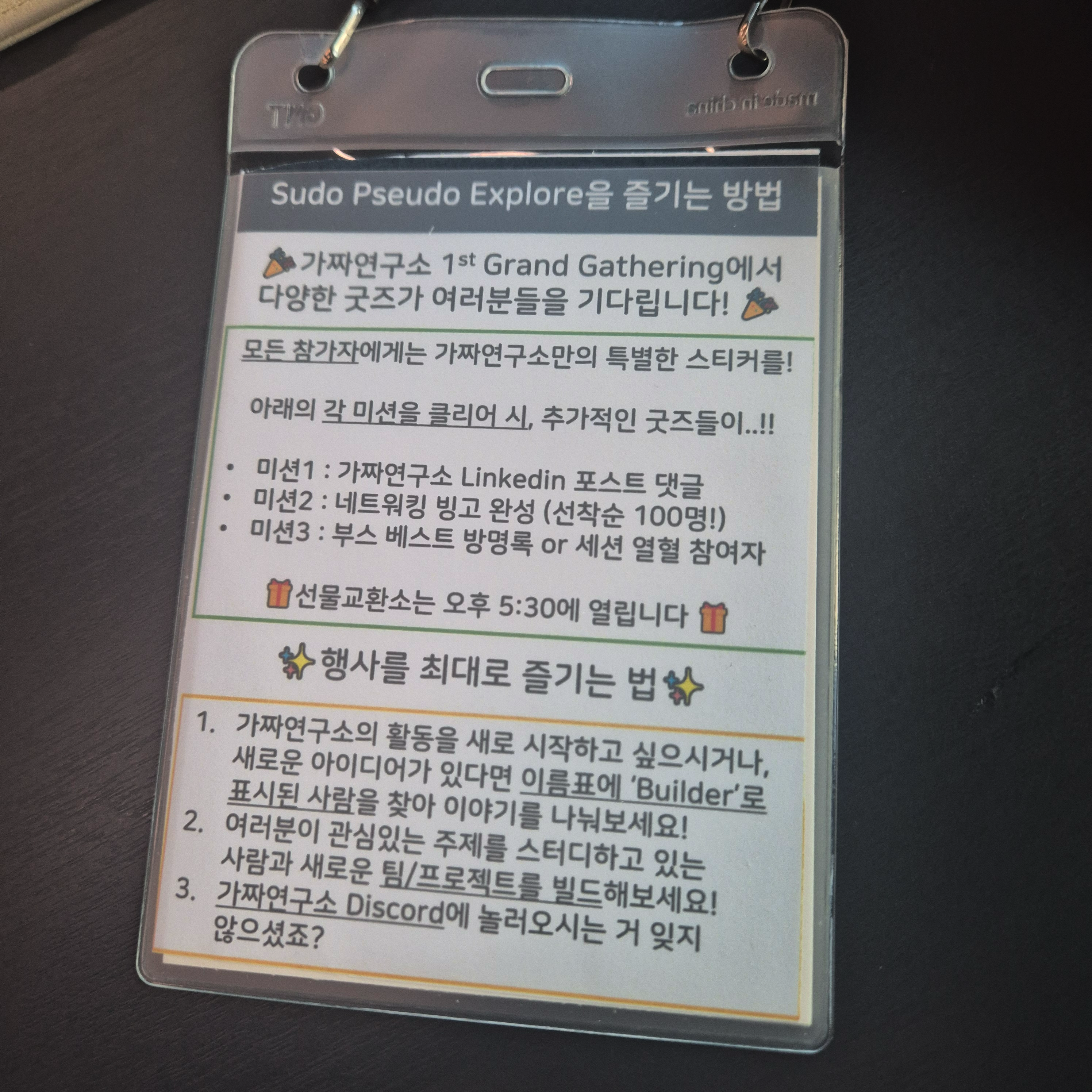 오늘 1st Grand Gathering - Sudo Pseudo Explore을 다녀오며 많은 자극을 받았고 AI에 이렇게 열중히 활동하시는 분들을 보며 제 의지를 다지게 되었습니다.