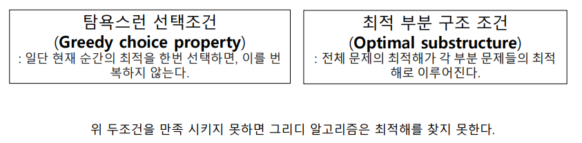 • 그리디 알고리즘을 사용하기 전에, 그리디 알고리즘을 사용해도 되는지 반드시 확인 해야 합니다.